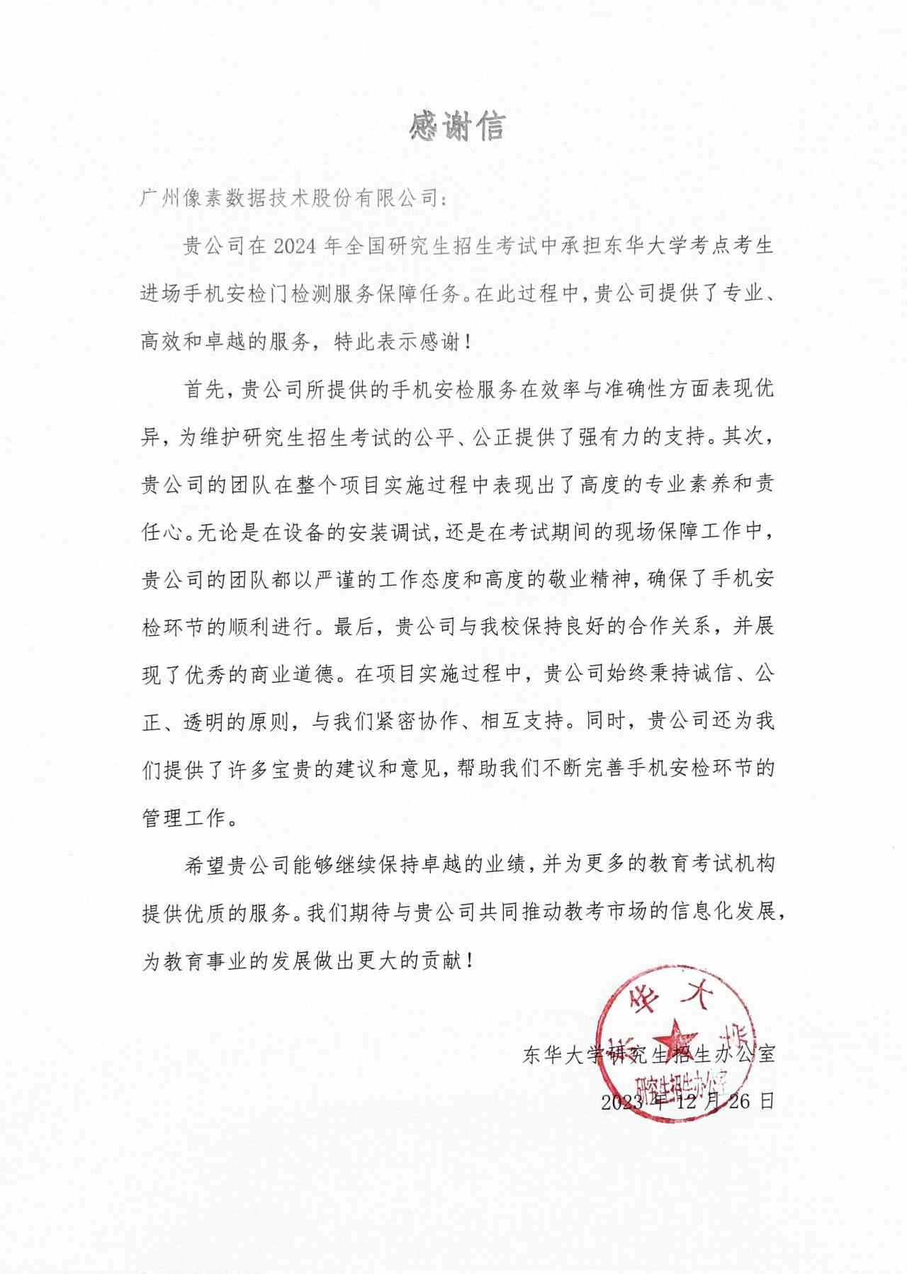 近日,像素数据收到了来自上海东华大学的感谢信,信中对公司在2024年全国硕士研究生招生考试项目考生进场手机安检门检测服务保障项目履约情况表示了高度的赞扬和肯定。